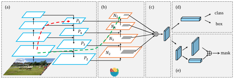 ![]() PANet2:向下一次特征融合,再向上一次特征融合;自适应 ROI |