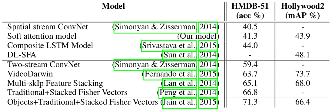 CNN 使用的是 GoogLeNet,分辨率为 224x224,共 30 帧,LSTM 为 3 层,每一层的隐藏神经元为 512 个,在非循环层使用 dropout;